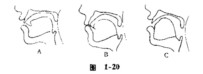 软腭和小舌也是口腔中能活动的部分,主要作用是改变气流的通路。在呼吸时软腭和小舌是下垂的,鼻腔和咽腔相通,气流由从鼻腔进出。说话时软腭和小舌有两种活动方式:一种是软腭和小舌向后上升,抵住咽壁,挡住通往鼻腔的通路,到达咽腔的声带音只能从口腔出去,在口腔形成共振。另一种是软腭和小舌下垂,咽腔通往口腔和鼻腔的通路都打开,到达咽腔的声带音可以同时从口腔和鼻腔两条通路出去,在两个共振腔里形成共振。这时如果口腔某一个部位闭塞起来,堵住气流,声音只能从鼻腔出去,就形成通常所说的鼻音;如果口腔和鼻腔的通路都畅通,声音同时从两条通路出去,就形成了所谓鼻化音,也叫口鼻音。图 1-20 是三种状态的示意图: