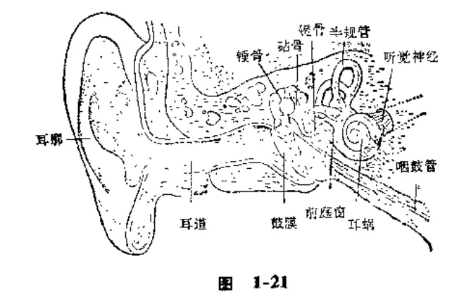 说话时发出声来,通过声波的传递,到达另一个人的耳朵里,听懂了意思,这才完成了语音的全过程。要想了解听觉器官是怎样接收和分析语音的,必须对人耳的构造有一个大概的了解。人耳能感觉到空气压力极微小的变化,是非常灵敏的器官,由外耳、中耳和内耳三部分组成,如图 1-21 所示: