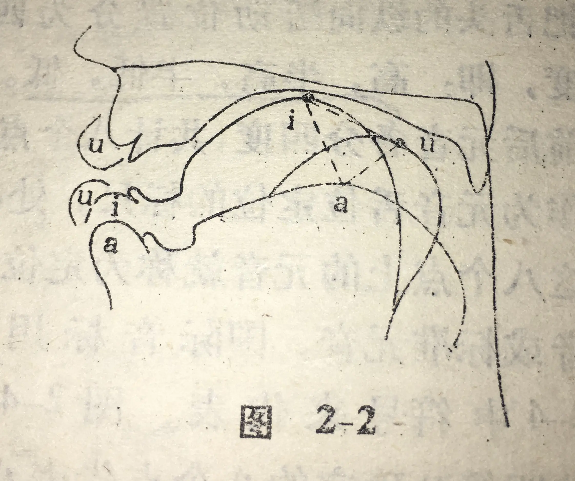 在确定元音音色的三项标准中,嘴唇的活动只有圆展之分,而且是可以看得见的,比较容易描写。舌头的活动非常灵活,从外部又完全无法看见,要说明它在口腔中的位置就比较困难。我们以 a,i,u 为例比较一下发这三个元音时舌头在口腔中变化的情况,这三个元音正可以代表发元音时舌头在口腔中活动的范围,基本情况如图 2-2 所示意。