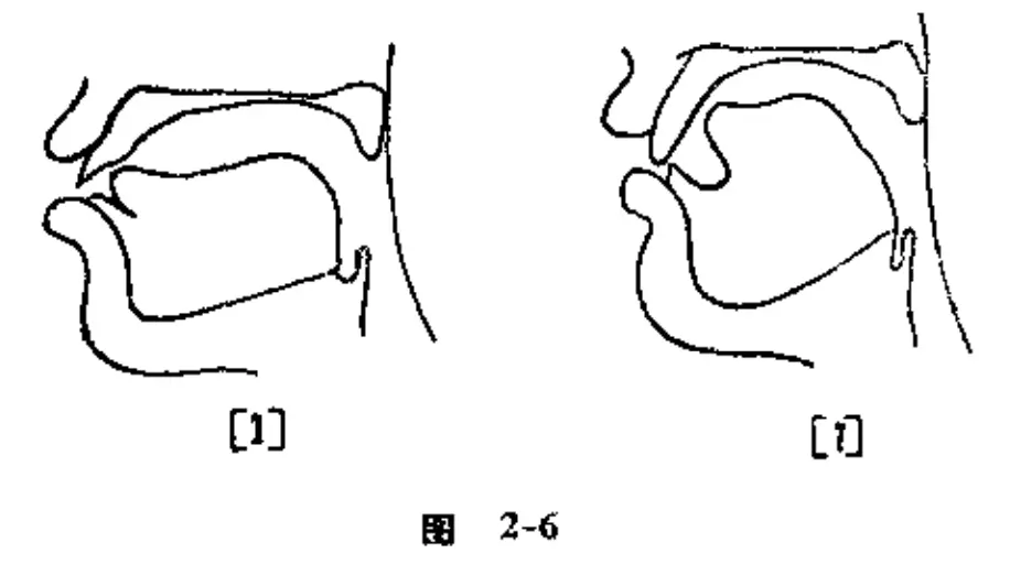 舌尖元音发音时,舌的中线呈马鞍形,实际上有两个舌高点,第一个在舌尖部分,第二个在舌面后部。[ɿ]的第一舌高点比[ʅ]靠前,第二舌高点又比[ʅ]靠后,从图 2-6 中可以看出这种区别:一般根据舌尖位置的前后,称[ɿ]为舌尖前元音,[ʅ]为舌尖后元音。
