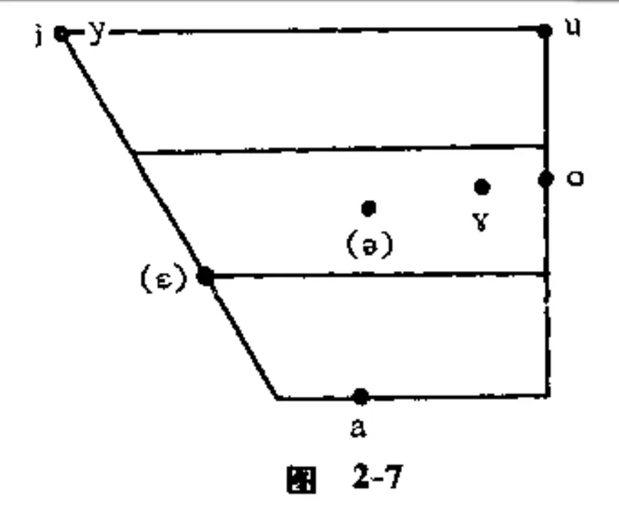 根据上面的描写,普通话舌面单元音在元音舌位图中的位置大致如图 2-7 所示。图中各元音的位置只是代表舌位的大致范围。由于说话人的习惯不同,普通话有的单元音舌位存在着个人读音差异。例如,有人读[y]时舌位略低一些,有人读[ɤ]时舌位略后一些。**低元音[a]的个人读音差异更要大,严式音标应该是[ᴀ],**有人舌位靠前,有人舌位靠后,但基本上都不出央元音的范围,图 2-7 采用了舌位靠前的读法。
