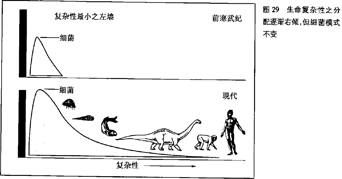 复杂性增加的右尾端,在生命的钟形曲线中出现,可能是(传统的说法)进化一直驱使生命变得更高等、更复杂;也可能是(我的论点)生命从左墙最简单的情况,成功地扩张,并保持不变的细菌模式时,所造成的意外结果。造成同样结果的两种方式,在意义上的重大差别,凭借本能,就足以区分。而这种本能是正确无误的。对于不同的意义,我们千万不可掉以轻心。因为,在一种情形下,复杂性的增加是生命史存在的理由;在另一种情形,右尾端的扩张,却是结果截然不同的进化原则所产生的消极后果。在一种情形下,进步规范、塑造了生命史,成为基本原因的主要产物。在另一种情形下,进步却是意外,稀少,而且没有直接有利的原因在作用。