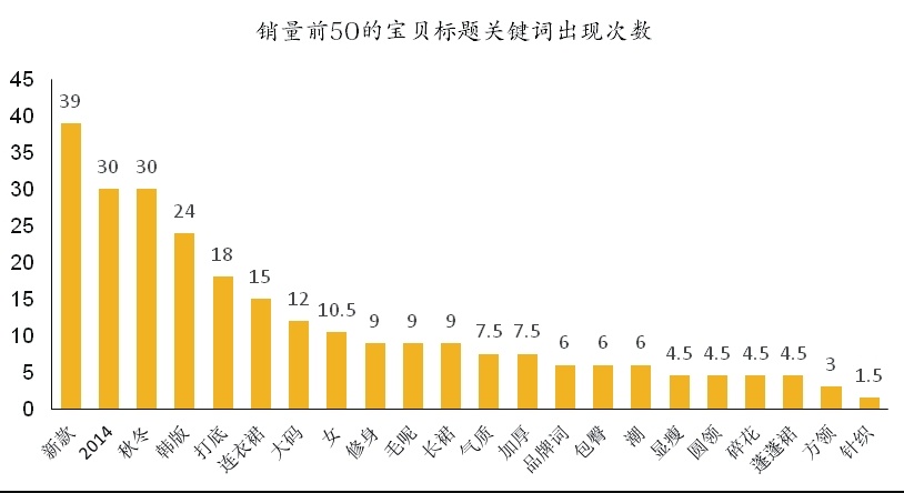 接着再来分析这些宝贝的标题关键词出现次数。要知道一个宝贝能上排行榜,能热销,它的卖家一定在标题上花了功夫,所以直接分析这些宝贝标题,就能快速得知当下某个类目下的商品热搜词是什么。下面的柱形统计图所示是出现频率较高的连衣裙类目下宝贝排名前 50 的标题组成关键词中出现次数较多的词汇统计图。从中可以发现“新款”“2014”(年份词)“秋冬”(季节词)是出现频率最高的三个词汇,可见买家搜索时会常常进行这三个词汇的搜索。那么卖家如果将这三个词植入自己的宝贝标题中,可以帮助带来自然流量。那么后面出现频率不太高的属性词例如“圆领”“蓬蓬裙”这样的词,既然出现在了排名前 50 的宝贝标题中,证明是有一定可取性的。这类词带来的自然流量相对不是特别大,但是它的转化率往往会比较高。卖家同样可以挖掘自己宝贝的属性卖点,进行关键词植入。前提是这些属性卖点词汇一定是要有卖家知道的、会进行搜索的词汇。