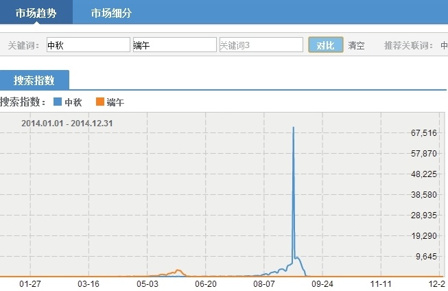 在淘宝指数中进行关键词“中秋”和“端午”两个关键词的搜索趋势对比,并且调整时间为一整年,结果如下图所示。从图中可以十分明显地看到,“中秋”这个关键词的搜索量是远远大于“端午”这个关键词的,并且两个词都是在节日所对应的时间点上,呈现搜索量突升的趋势。从中可以得到的启示是:中秋节可以用来营销的点是多于端午节的,与中秋节相关的商品量也是多于端午节的。举一反三,卖家就可以用这样的方法,来为一年中所有的节日区分出不同的营销力度来。