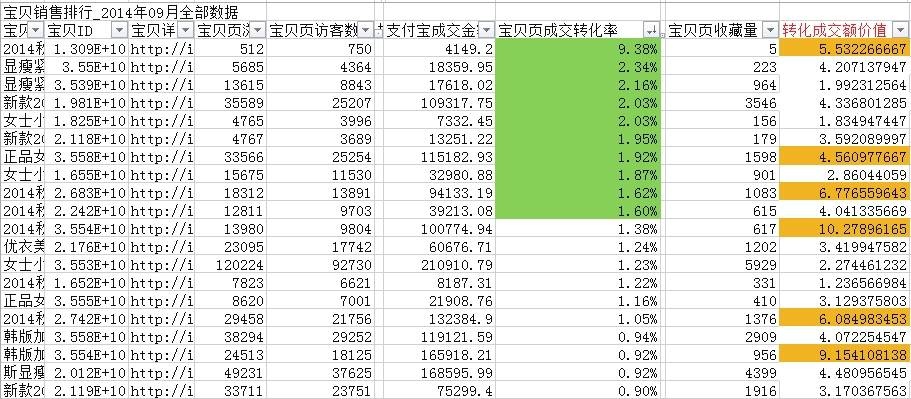 转化率降序后,卖家选择一个优质宝贝的转化率范围,如这里选择将转化率大于 1.50% 的宝贝转化率数据单元格标识为绿色,结果如下图所示。同时拥有绿色和橙色单元格数据的宝贝就是转化率高、转化金额也高的宝贝,可以考虑加强推广力度,为店铺带来更多的利润。
