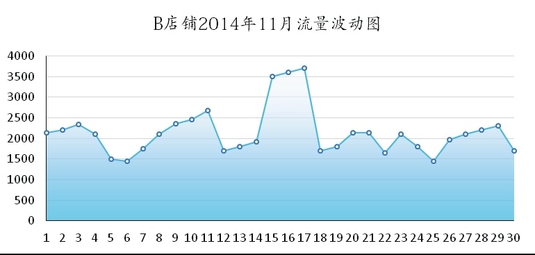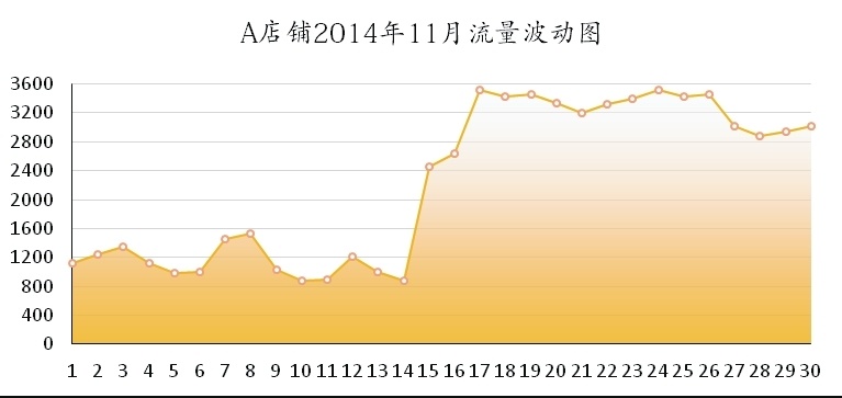 下图所示是 A 店铺一个月的流量波动图。这家店铺在 2014 年 11 月中旬,也就是 15 号这天开始做了一场全场 8 折、为期 3 天的活动。从图中检测到的数据可以看出,店铺在 15 日活动之前的流量有高有低,呈起伏状,但是 15 日、16 日、17 日这 3 天中流量骤增,之后虽然也有小起伏,但是总体呈上升趋势。这就是一个店铺活动后该有的效果。