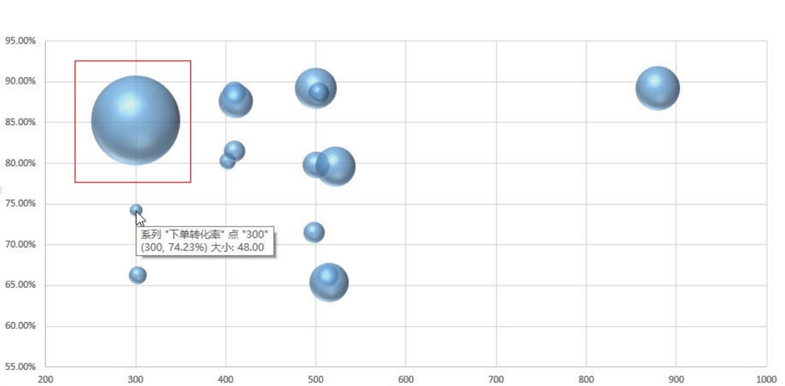首先来分析宝贝的“浏览量”“下单转化率”“下单金额”三项数据,做气泡图。