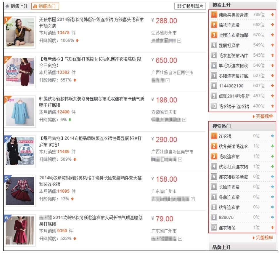 除此之外,从淘宝排行榜中销售热门榜单的右边,有“搜索上升”“搜索热门”这样的区域。其中显示了搜索上升最快和搜索最热门的一些词汇,从中也可以得到一些搜索量大的词汇。如果卖家能从中发现优质词汇就更好了。