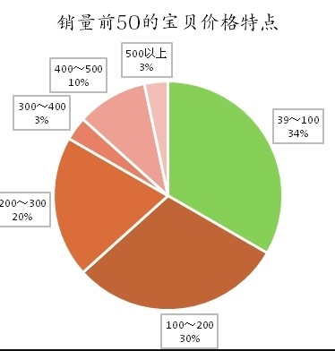 下面三张图是通过查看排名前 50 的宝贝主图特点、价格分布、标题关键词所做的统计。这些宝贝的销量能排名靠前,一定有其独到之处,那么卖家就可以通过观察、统计,总结出一定的规律。尤其是对于那些经验还不够丰富,并没有形成自己独到市场认知的卖家来说,模仿大部分销量好的宝贝营销特点,或许不能将宝贝卖爆,但是至少也不会让销量差得难看。