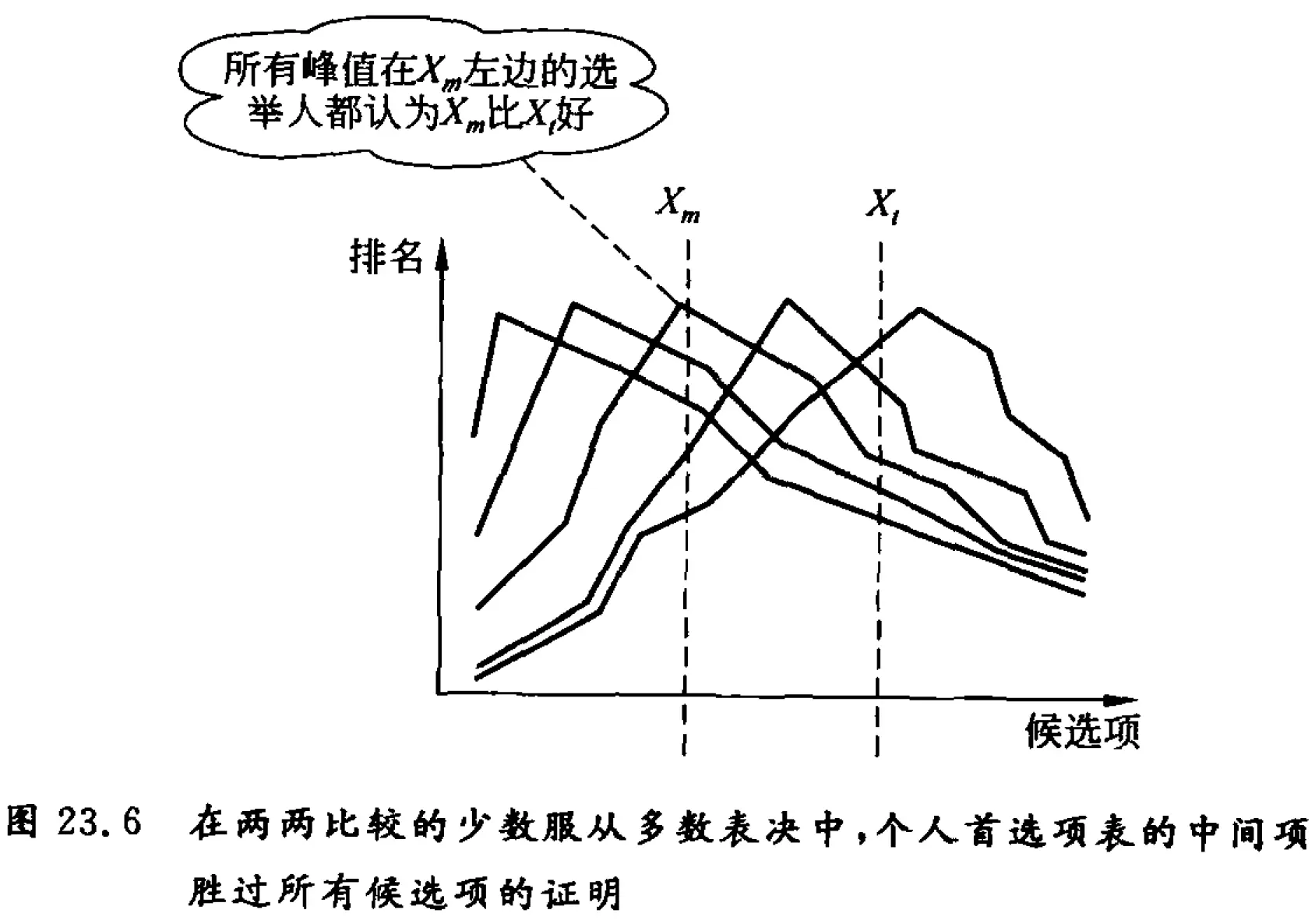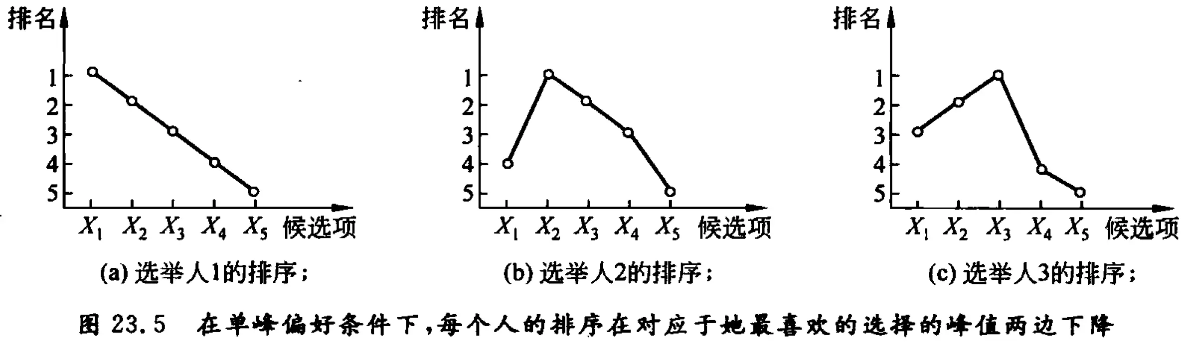 除了同时和顺序投票之间的这种区别外,第 23.7 节的孔多塞陪审团定理的情况与第 16 章信息级联模型是非常相似的。在这两种模型中,有一个“X 是正确的”先验概率,而且有偏向正确候选项、以概率大于 1/2 出现的私有信号。因此,我们可以利用在 16.5 节的分析来论证,如果选民依次行动,最初两个人投 X 的票,将导致随后的人也都投 X 的票,不论 X 是否正确的决定。更一般地说,一旦一个候选项得票数超过另一个候选项两个,就会形成一个连锁反应,所有后续选民都会选择不顾他们自己的信号而随大流了。