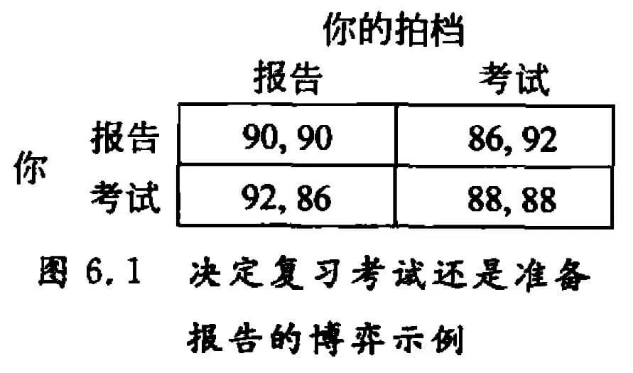 2×2 表格巧妙地表现了博弈论背景的设置。现在,需要决定行为选择:是准备报告,或是复习考试?很显然,各自的平均成绩不仅取决于个体在这两个备选项之间进行选择,还取决于你拍档的决策,即互动的他人的选择。因此,作为各自决策的一部分,参与方必须对对方可能性行为进行合理推理。当考虑自己策略的后果时,必须想到他人决策的影响,这正是博弈论的用武之地。所以,在分析考试或报告例子的结果之前,先介绍博弈论的一些基本定义,然后再继续用博弈论语言加以讨论。