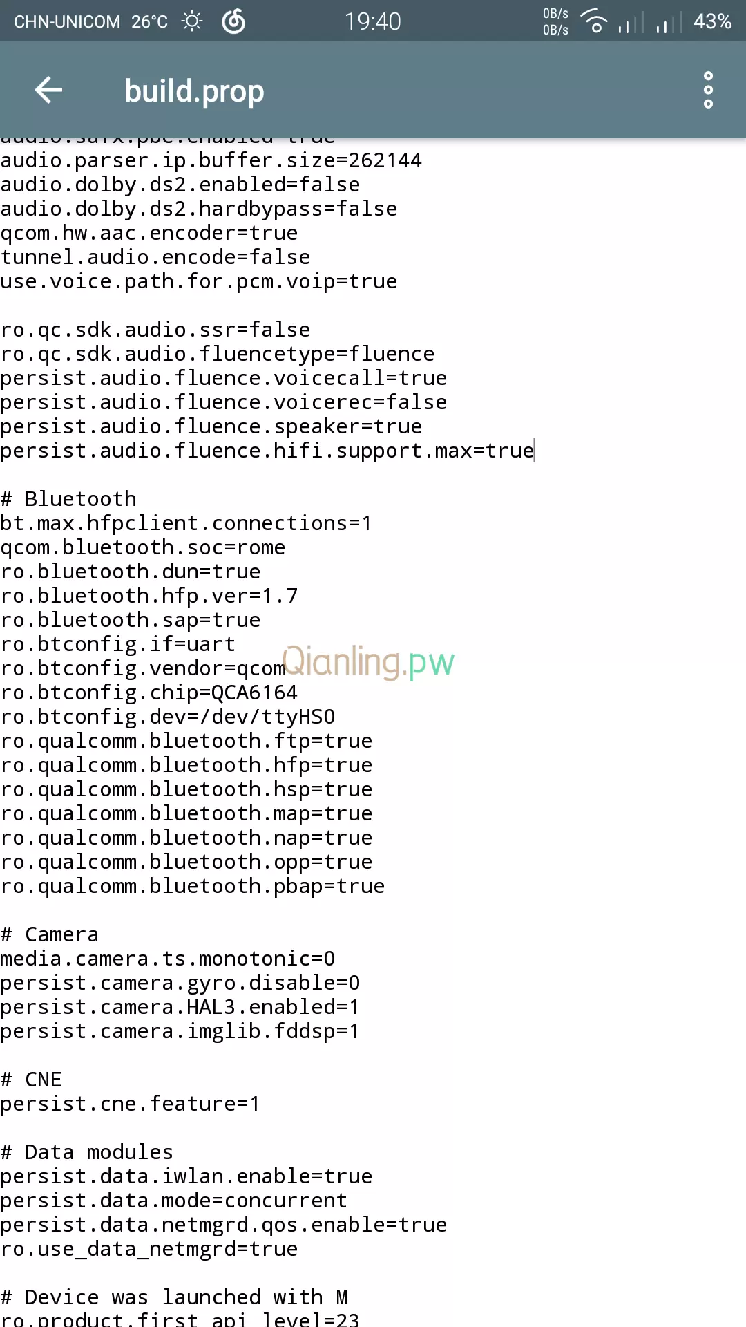 高通处理器强制开启 Hi-Fi 发表于 2017-07-01 分类于 Android 阅读次数 评论数 打开 /system/build.prop ,选择“以文本方式编辑”,进入编辑界面后找到如图所示位置 添加以下代码: 1persist.audio.fluence.hifi.support.max=true 重启手机 修改后底噪减少,声音变小