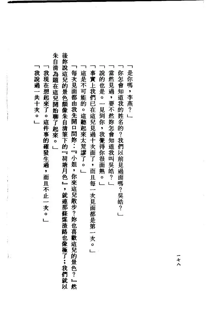 「毎次见面都由我先开口问你:『小姐,你来这儿散步?你也喜欢这儿的景色?』然后你说这儿的景色颇像朱自清笔下的『荷塘月色』,就连那条煤渣路也像极了;我们就以朱自清为题在这儿开始聊了起来。」